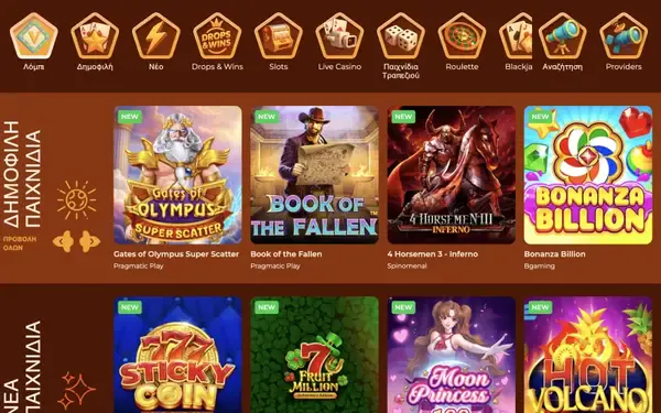 Το λόμπι του καζίνο μας είναι φτιαγμένο με έμφαση στο βάθος και στο εύκολο φιλτράρισμα, με 5000 τίτλους σε πολλές κατηγορίες. Μπορείτε να περιηγηθείτε ανά πάροχο, θέμα και χαρακτηριστικό, και να αποθηκεύσετε αγαπημένα για να επιστρέψετε αργότερα. Συνεργαζόμαστε με studios όπως Hacksaw Gaming, Play’n GO, BGaming, Iconic21, Evoplay, Gaming Corps, Fantasma Games, Betsoft, Playtech και Spinomenal. Αν και το RNG μας δεν ελέγχεται δημόσια, πολλά παιχνίδια εμφανίζουν πληροφορίες RTP στις οθόνες βοήθειας ή κανόνων, και προτείνουμε να το ελέγχετε πριν ποντάρετε.